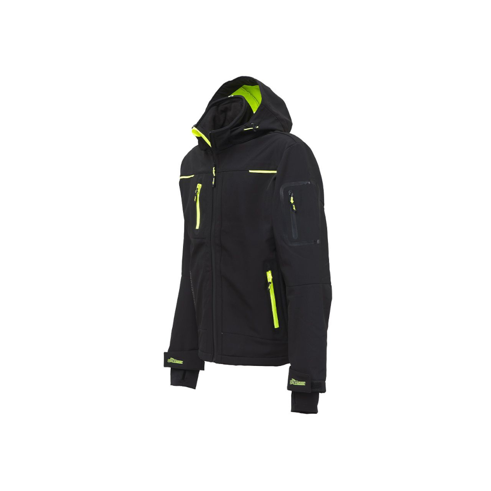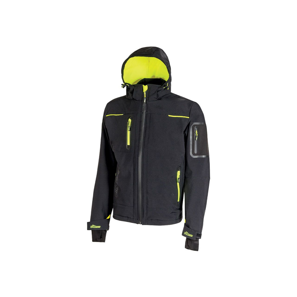 Soft-Shell-Jacke mit U-Tex Membran, ist dehnbar in 4 Richtungen, wasserabweisend, winddicht, atmungsaktiv, widerstandsfähig sehr bequem mit einem weichem Neon-Microfleece Innenfutter. Zentraler wasserdichter Reißverschluss. Vorgeformte Ärmel für eine optimale Passform. Kapuze verstellbar und abnehmbar. Elastische winddichte Ärmelbündchen mit Klettverschluss und Daumenloch. 2 Fronttaschen mit Neonreißverschluss und innen befindet sich ein elastischer Kordelzug um den Jackenbund einzustellen, dadurch kein Hängenbleiben. 2 große Innentaschen, 1 thermisch-verschweißte Tasche am linken Ärmel. Eine Handy Brusttasche mit Free Sound-Technologie und Neonreißverschluss. Der Jackenbund ist geformt und am hinteren Teil des Kragens ist ein Reflexband angebracht. Mit U-Power-Logo, Ton in Ton.